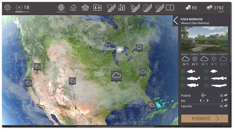 Za podróż na poszczególne łowisko jest odpowiedzialna zakładka MAPA. Obecnie do dyspozycji wędkarzy dostępnych jest 7 map położonych na terenie USA. Na pierwszym poziomie dostęp mamy do łowiska Missouri, w miarę doskonalenia naszych umiejętności i zdobywania wyższych wędkarskich poziomów odblokowujemy kolejne łowiska z innymi gatunkami ryb.