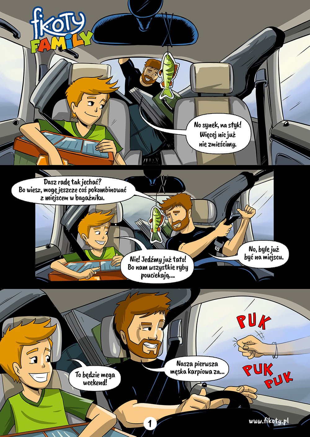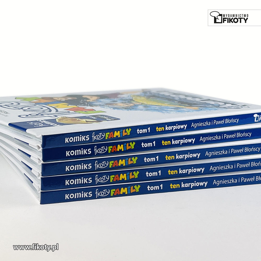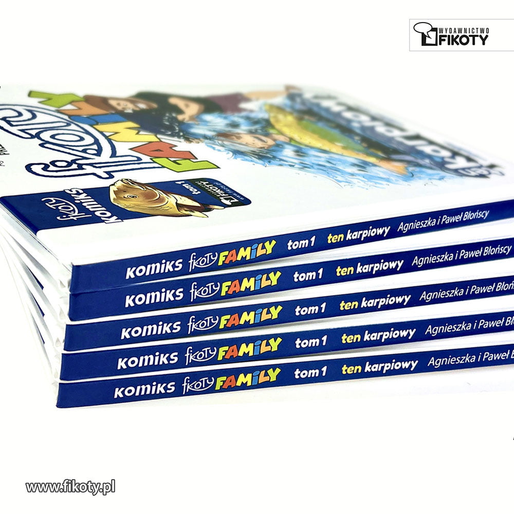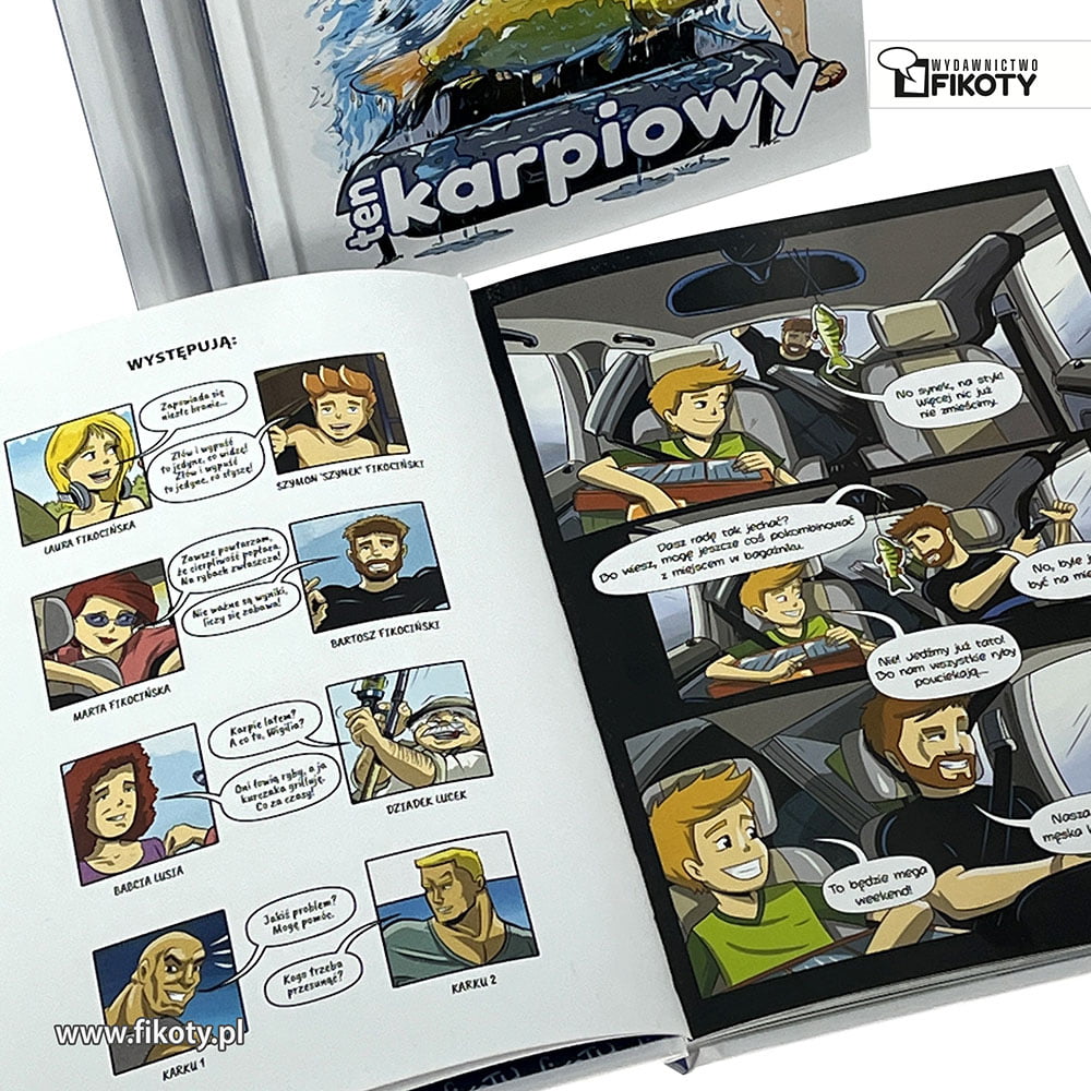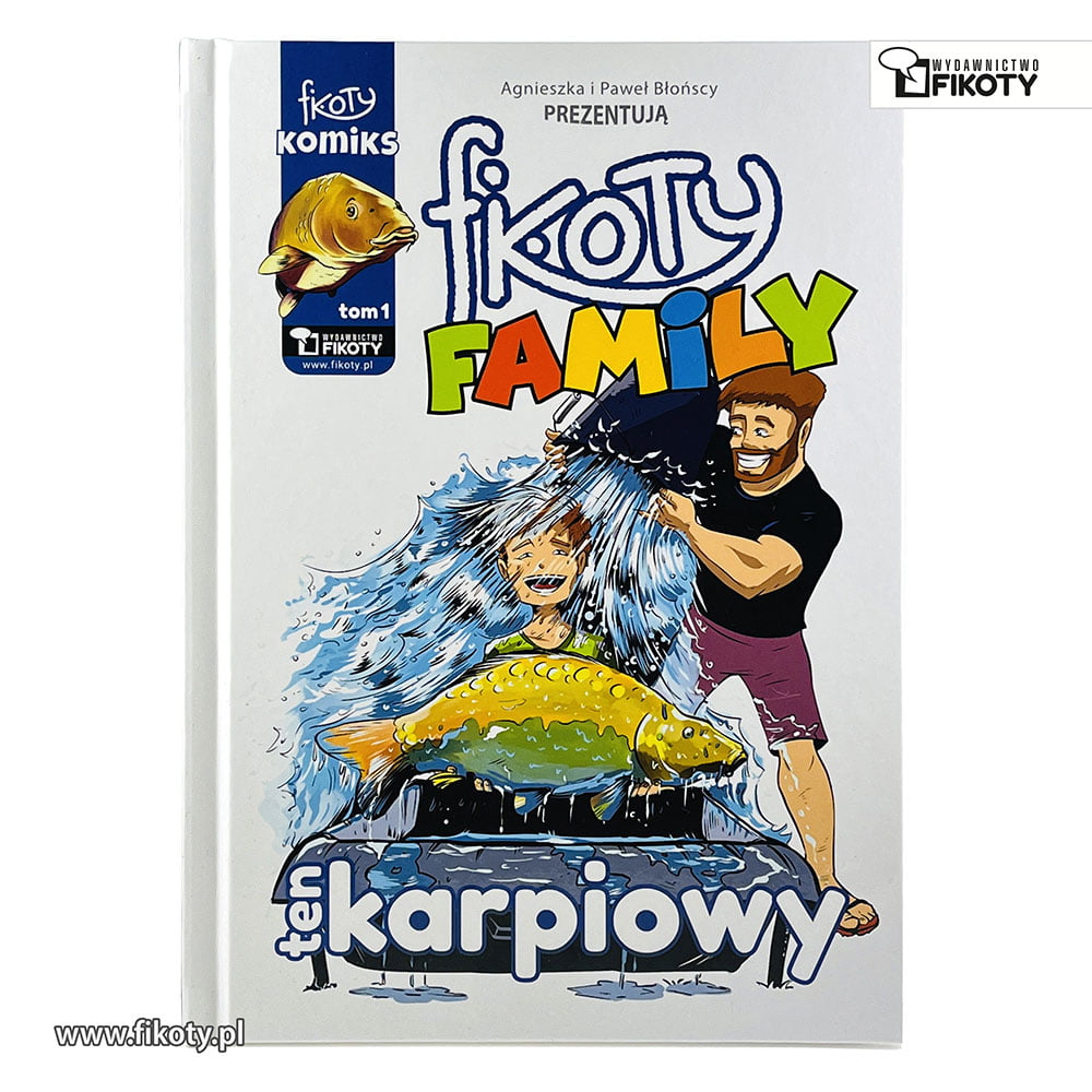 Komiks Wędkarski Fikoty. Komiks „Fikoty Family – ten karpiowy” to edukacja i przygoda w jednym dla całej rodziny. Jak sam tytuł wskazuje, pierwszy tom komiksu Fikoty Family poświęcony jest tematyce karpiarstwa. W fabule główną rolę odgrywa zwariowana rodzinka Fikocińsich, która wybiera się na swoją pierwszą w życiu zasiadkę karpiową. Już sam dojazd na Łowisko sKARPetka jest dla Fikocińskich sporym wyzwaniem. Czy miejscówka obdaruje ich pięknymi wynikami? O tym dowiecie się w komiksie!